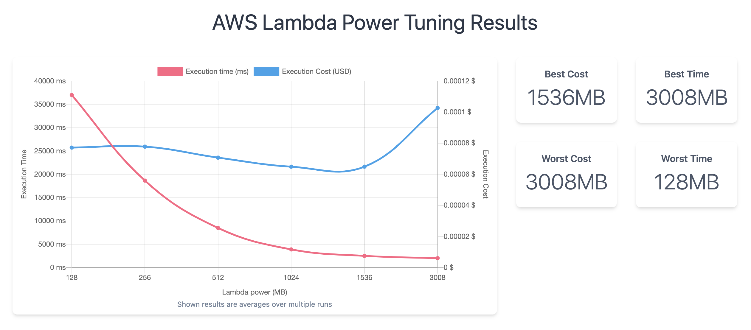 How to interpret the chart above: execution time goes from 35s with 128MB to less than 3s with 1.5GB, while being 14% cheaper to run.