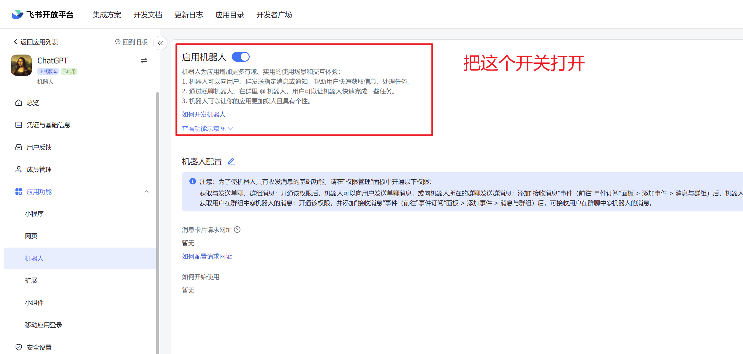 上述这些都配置完成后,你的机器人就配置好了,接下来只需要在飞书开放平台后台找到应用发布,创建一个全新的版本并发布版本即可。
