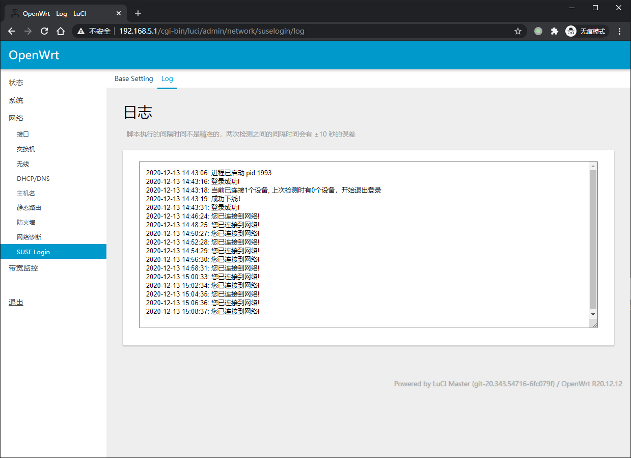安装完毕后在 网络 - SUSE Login 点击启用并填入用户名和密码选择你的运营商后点击右下方的保存&应用,查看日志当提示登录成功时说明已登录成功。