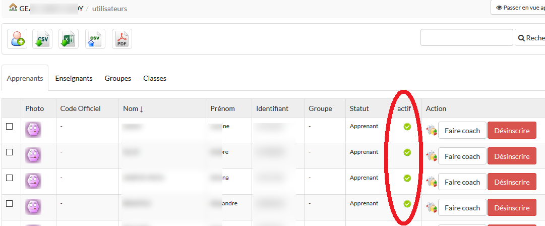 Il semblerait donc que lorsque l'on visualise la liste d'utilisateurs du cours, le champ actif/inactif correspond en fait à la situation du compte sur la plateforme (pas dans le cours).