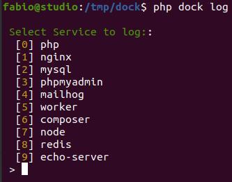 with the php dock log command, a service selection prompt will be displayed and will let the user choose a service for showing its live log: