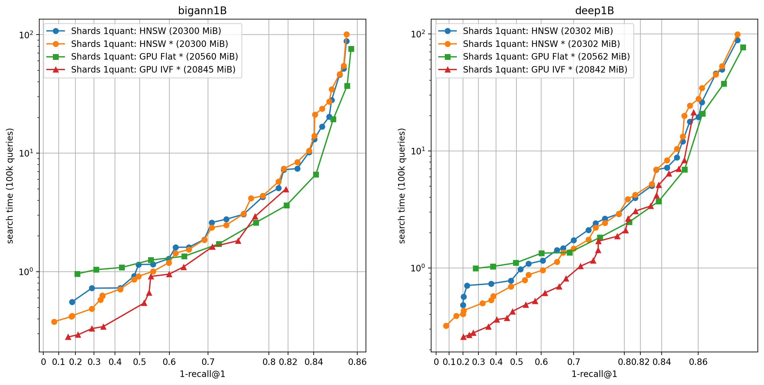 IndexShardsIVF) gets the best operating points. This is enabled viaGpuMultipleClonerOptions.common_ivf_quantizer = true - in this setting the ratio of GPU compute over CPU compute increases, so it becomes less interesting to use the CPU (HNSW) to do coarse quantization