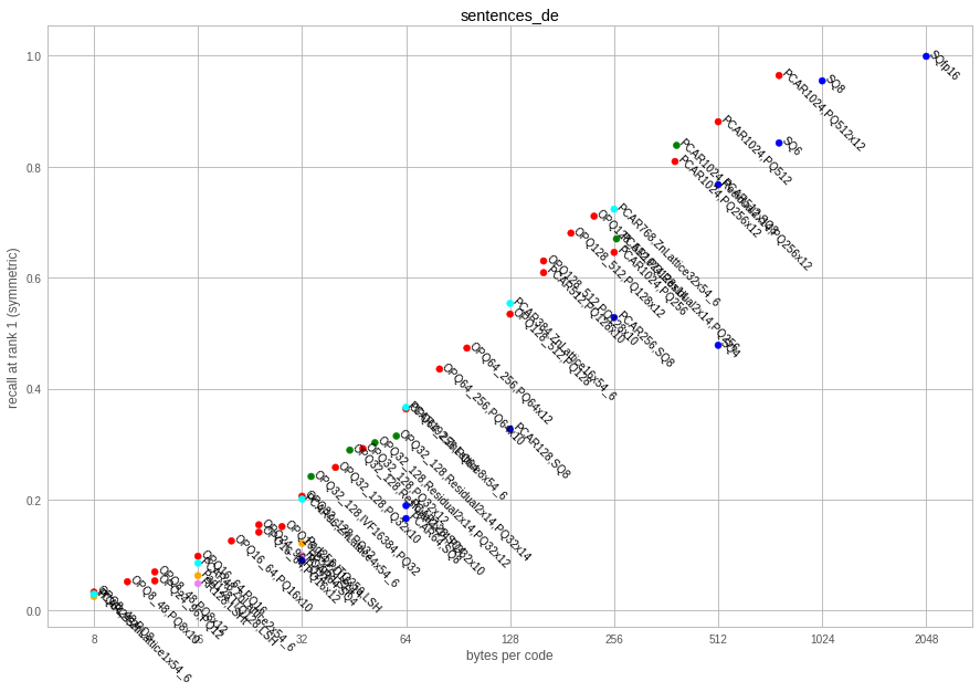 We report these measures in tables, sorted by increasing code size. We also show plots of the symmetric search accuracy. The codecs we tested were chosen from a reasonable set of baselines. It is possible that a bit more of fine-tuning can increase their performance.