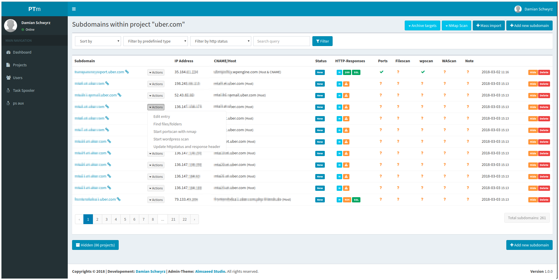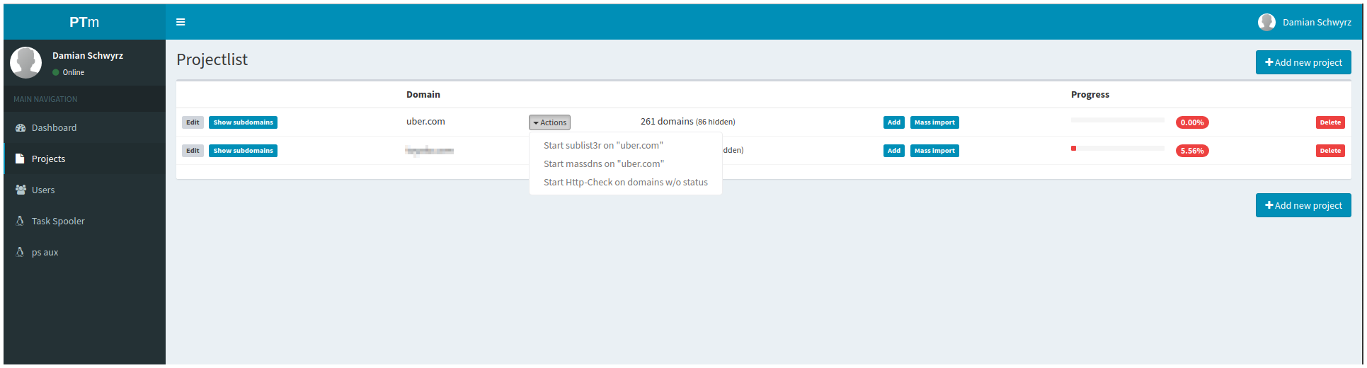 - Adding "projects" (domains and some basic stuff) and scanning those with different tools (massdns, sublister, axfr, ...)