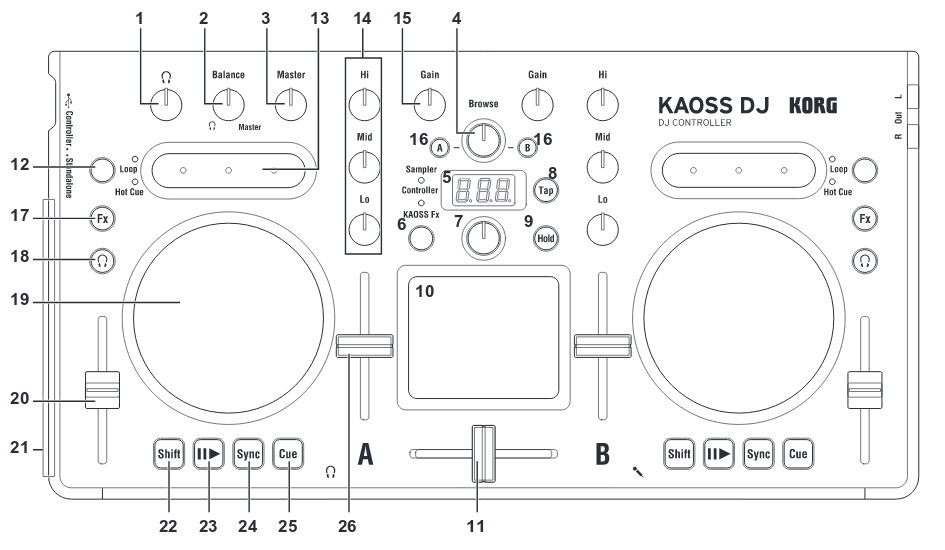26 | Level fader | Adjusts the level of deck A/B | --- |