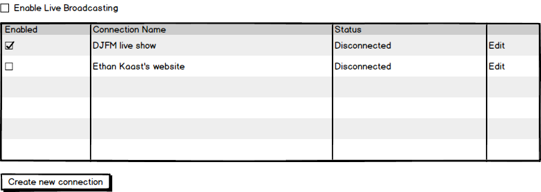 Built on top of the profiles subsystem implement of Phase 1, these additions provide the actual multi-broadcasting functionalities which will allow users to do Live Broadcasting to several Icecast/Shoutcast servers. Management of the streaming connections is done in the Live Broadcasting Preferences panel. It shows the list of configured broadcasting outputs, and selecting a connection in the list shows its profile settings in an editable form below the connections list. While Live Broadcasting is active, each individual connection can be enabled, disabled and re-enabled again.