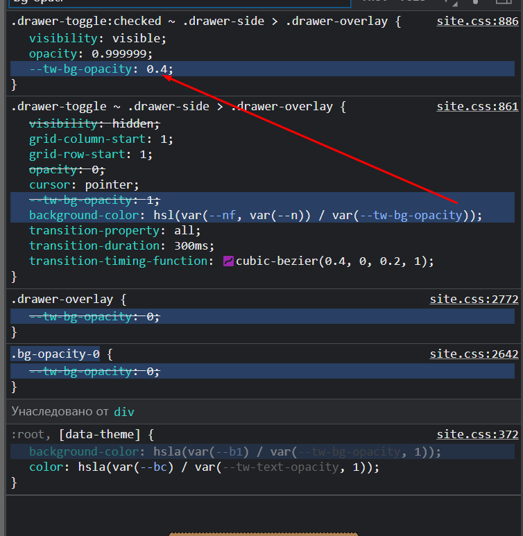 <input id="my-drawer" type="checkbox" class="drawer-toggle [&:checked~.drawer-side>.drawer-overlay]:[--tw-bg-opacity:0]" />https://play.tailwindcss.com/HveFnBMW82 Or you can change the CSS yourself: .drawer-toggle:checked ~ .drawer-side > .drawer-overlay{