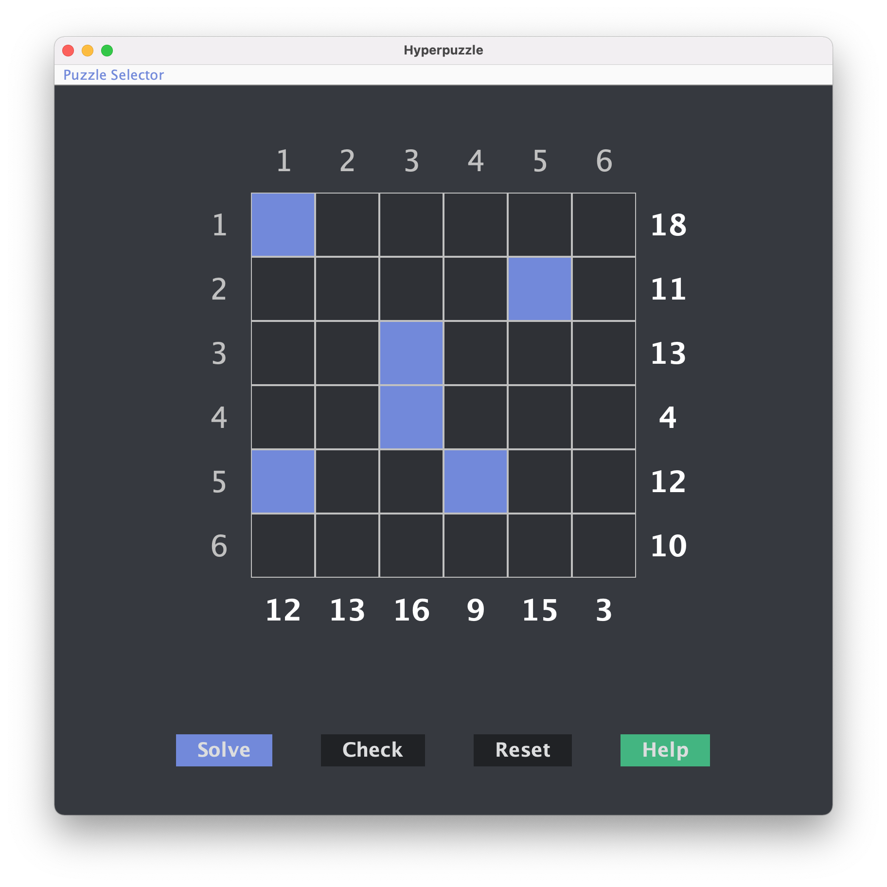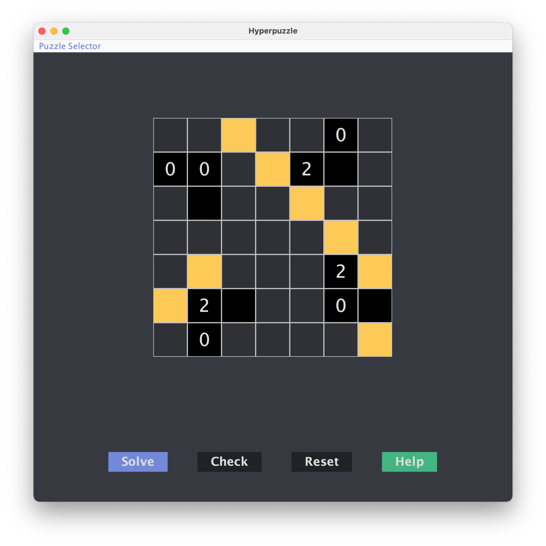 Hyperpuzzle A collection of three logic puzzles and solvers implemented in Java's Swing GUI framework. Features: Depth-first recursive puzzle solver Game constraint checker Puzzle instruction popups Game loading from files Fully embraces OOP and DRY principles Screenshots: Akari (Light Up) puzzle Skyscraper puzzle Kakurasu puzzle