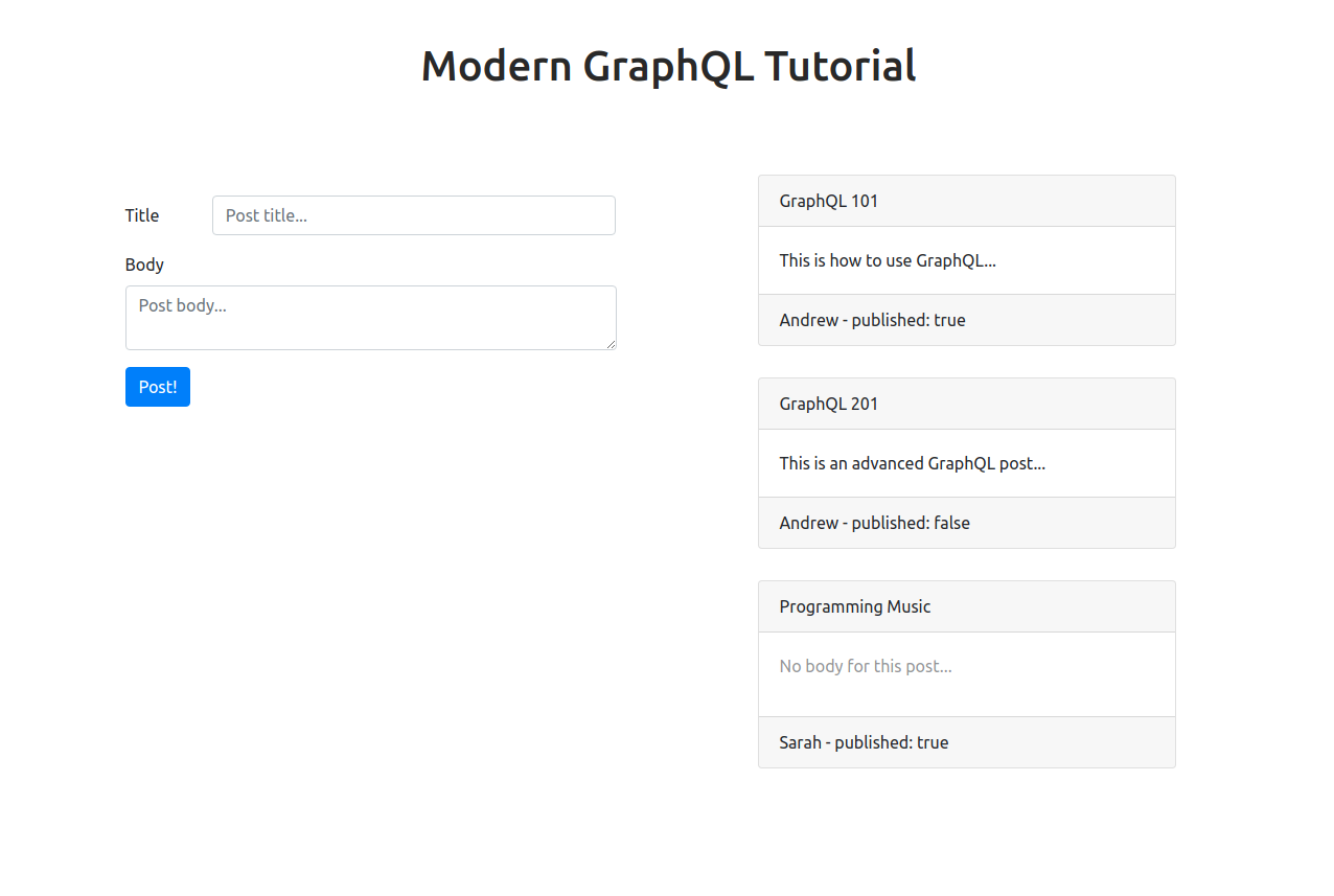 const [addPost] = useMutation(CREATE_POST_MUTATION)I also created a callback, handleFormSubmit, which is run everytime the form is submitted. This callback uses formTitle and formBody, which are just simple react useState's. Basically, useMutation returns an array, containing a function that you can call to make POST requests to the server.