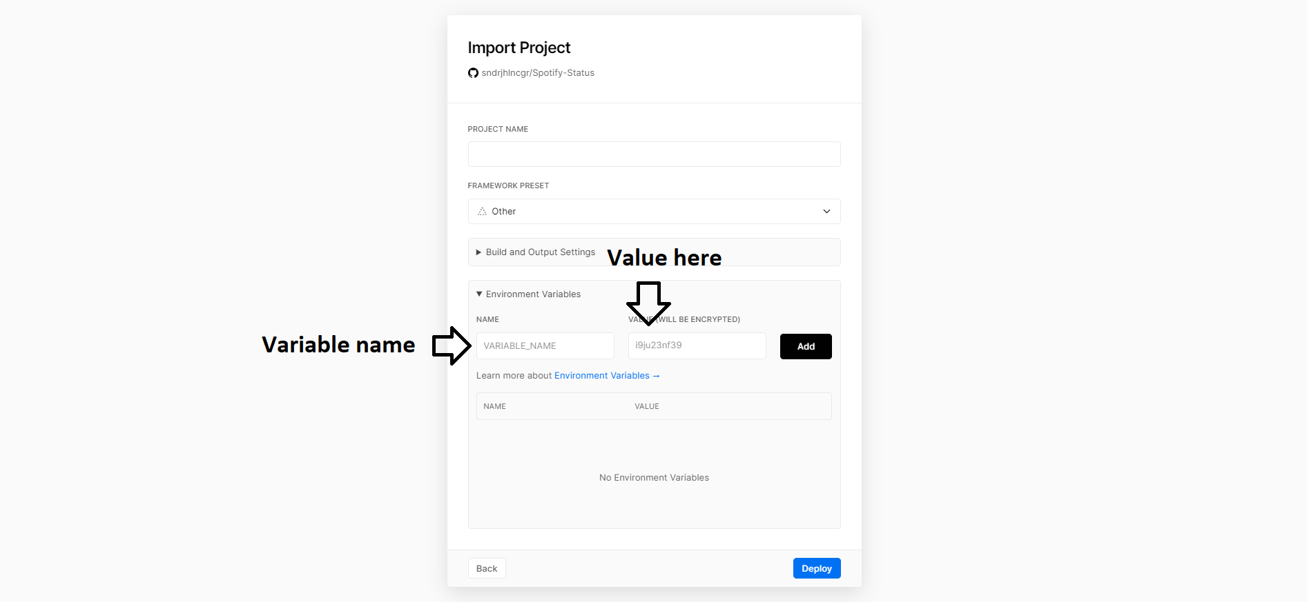 Add Project Name and Environment Variables: Warning: Avoid white spaces!!