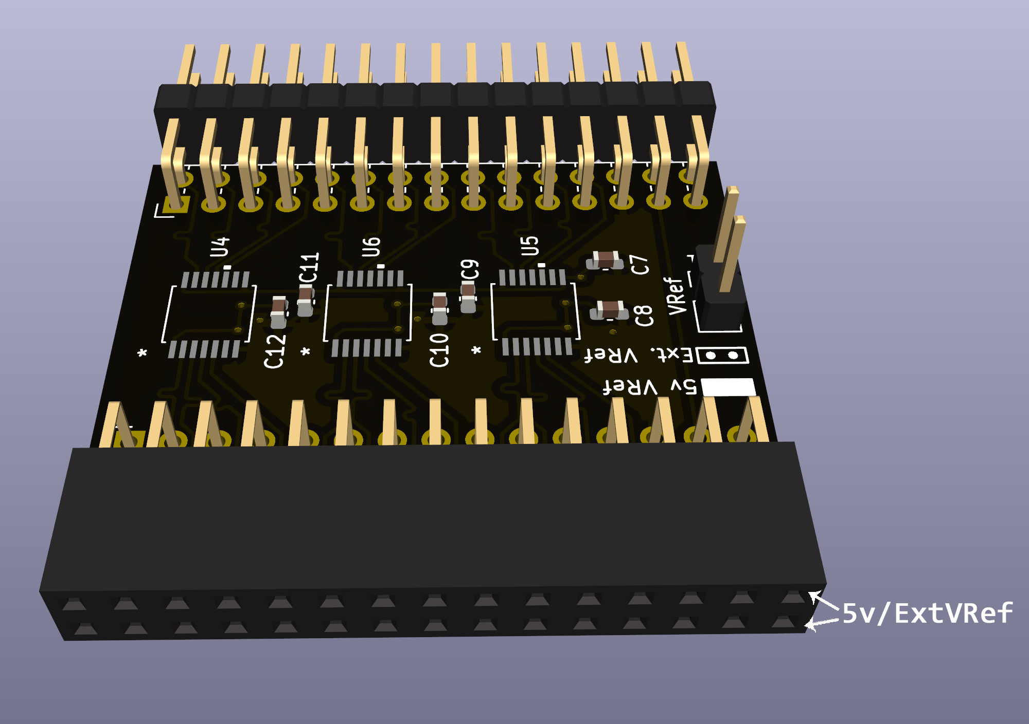 To use an external VRef source you need to remove the jumper JP1 and connect the external voltage reference to the +5v/ExtVRef pins of the input header.