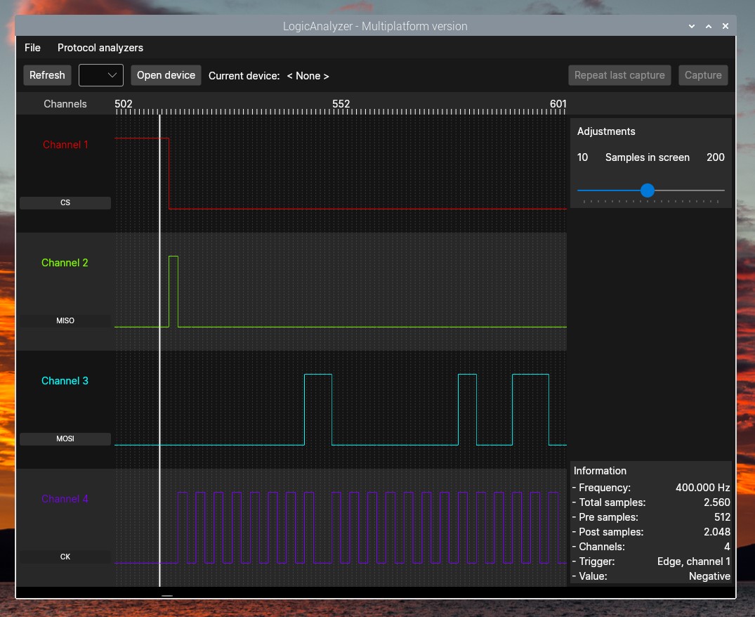 For now I have already implemented a SPI protocol analyzer but I plan to implement also I2C, RS-232 and system bus analyzers (for old computers, 16 address bits and 8 data bits). In any case, with little knowledge of C# you can add your own protocol, which makes the program capable of analyze proprietary protocols.