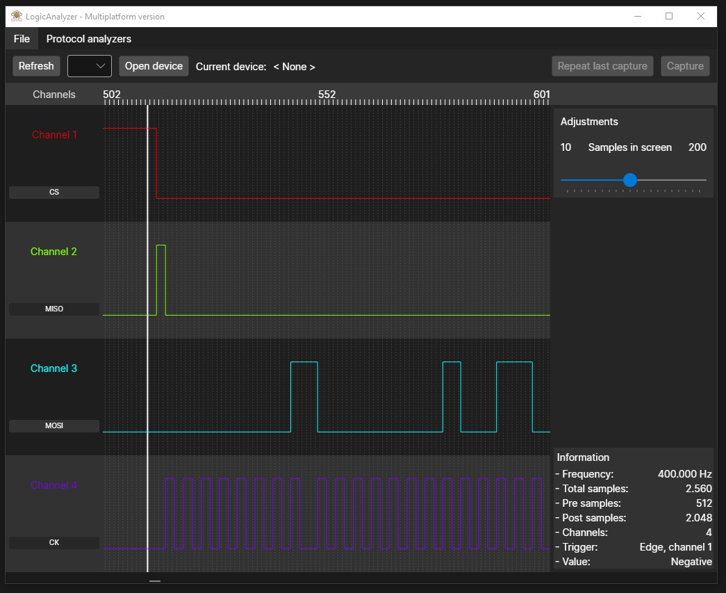 Once the capture has finished you will see the channels, a range of up to 100 samples and the trigger event will be right at the left side of the sample area.